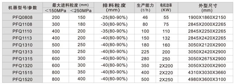 三、、強(qiáng)力型反擊式破碎機(jī)技術(shù)參數(shù)